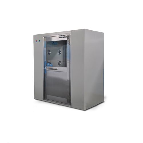 風/貨淋室是人/貨進出潔凈室所必需的通道,并同時起到氣閘室密閉潔凈室的作用。為了減少由于人/貨進出所帶來的大量塵埃粒子,經(jīng)高效過濾器過濾后的潔凈氣流由箱體兩側可旋轉噴嘴噴射至人/貨表面,有效而迅速清除塵埃粒子,清除后的塵埃粒子再由初、高效過濾器過濾后重新循環(huán)到風淋區(qū)域內(nèi)。為了達到吹淋的最佳效果,風/貨淋室設計的噴嘴出風口風速能達到20m/s以上,吹到人身上的風速最低1 8m/s,出廠的初始風淋時間設置為15秒。